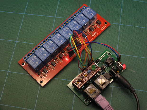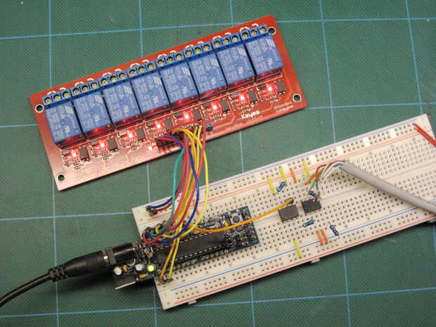 Aquí es un simple bosquejo de Arduino que controla la placa de relé de 8 canales en la foto. (Usted necesitará instalar la biblioteca de DMXSerial escrita por Matthias Hertel en http://www.mathertel.de).