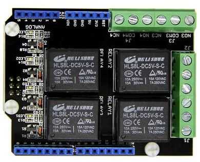 En placa de relé de Seeed Studio canal 4, los relés son controlados por la D4, D5, D6 y D7 tan solo puede conectar este escudo de relés en la parte superior el Bluetooh Shield V2 para obtener un completo control remoto de hasta 4 relés controlados por Android y pfodApp. Utilice pfodDesigner para diseñar el menú Android y generar todo el código que necesitas.