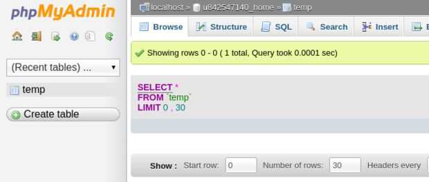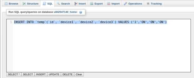 goto siguiente la pestaña sql pegar esta consulta y haga clic en ir "INSERT INTO ' temp'('id', 'device1', 'dispositivo2', 'device3') ('1 ',' ON', 'En', 'ON') los valores"