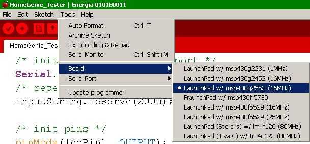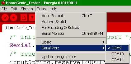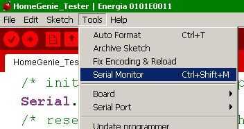 Abrir el firmware adjunto: HomeGenie_Tester_Firmware.zip/HomeGenie_Tester.ino