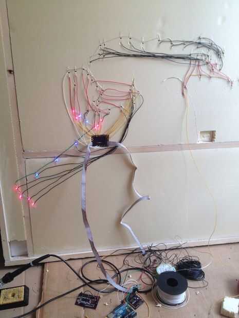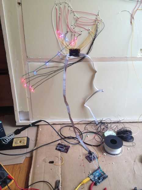 Cada uno de los 3 controladores de LED están en un tablero pequeño diferentes, por lo que he podido implementar en 3 áreas diferentes. Esto me permite dividir el número y la longitud de los cables entre el LED de cada placa. El 4 º es una independiente placa Arduino (que significa un Arduino "casero") con la parte eléctrica (regulador de 5V, cable de alimentación y condensador) y el multiplexación control líneas de transistores. Cada tablero se ligan junto con un cable de cinta de tablero a tablero conectado de cabecera masculina básica. También he añadido un botón con un 10 k Levante la resistencia para poder cambiar entre dos tipos de animaciones.