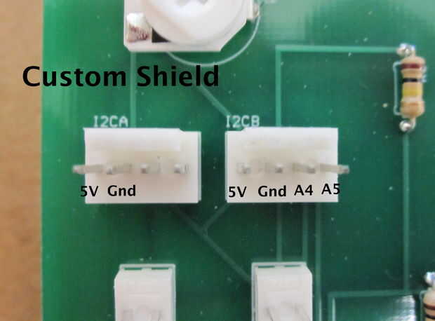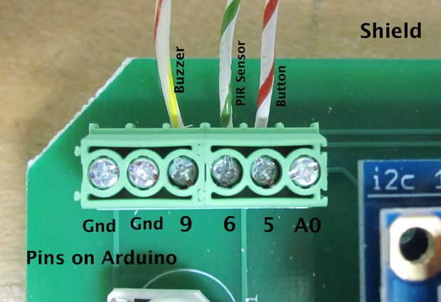 El sensor de movimiento Futurlec tiene 5 pernos. Sólo usé los 3 pernos adyacentes en la parte delantera. De izquierda a derecha, los pasadores son Vcc a tierra. Conecté Vcc a la fuente de 5V de Arduino (en el escudo personalizado utiliza I2CA para 5V y tierra), de tierra a la tierra en I2CA y a pin 6 en el Arduino (en el escudo personalizado, pin 6 correspondió al tercer tornillo en el terminal de tornillo verde).