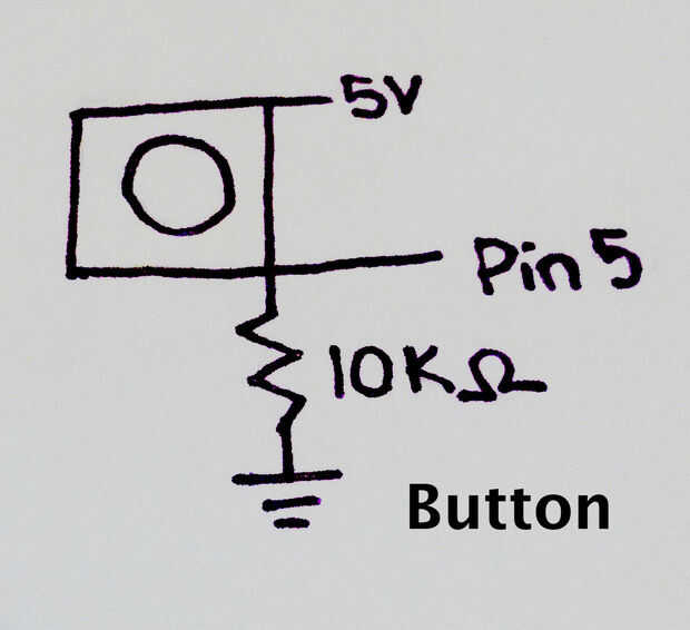 Uno de los pines en el botón debe estar conectado a 5V, el otro debe sujetarse a un resistor de 10kOhm y luego a tierra (ver foto enganchar para arriba) y al pin 5 en el Arduino (2 º terminal en el borne de tornillo verde mi escudo).
