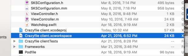 Eso es todo! Cocoapods es para Crazyflie, y estás listo para empezar a buscar en los proyectos en Xcode. Asegúrese de que está viendo a "Crazyflie cliente. xcworkspace"en vez de"Crazyflie cliente. Xcodeproj"o las vainas no se mostrarán correctamente.