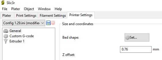 Primero: Z offset, si usas Slic3r para cortar el objeto usted puede encontrar esta información en: configuración de la impresora > General.