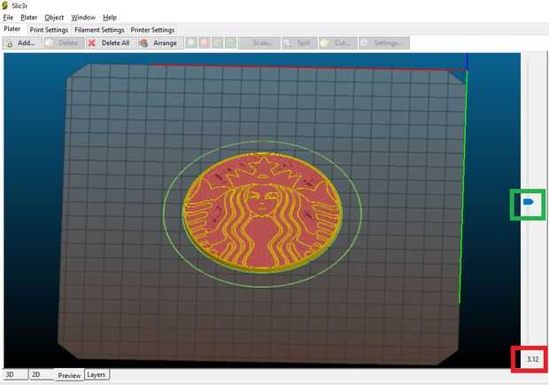 Podrá ver su vista previa de todo el modelo. Juega un poco con el botón alta z para encontrar la primera capa con el segundo filamento de color. Escriba ese número también.