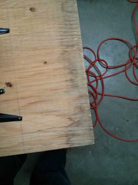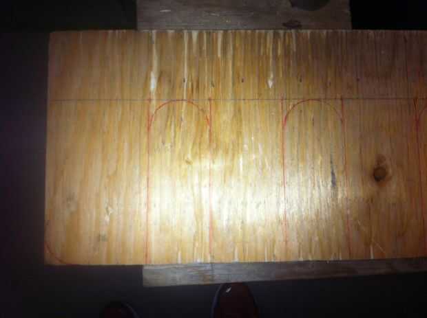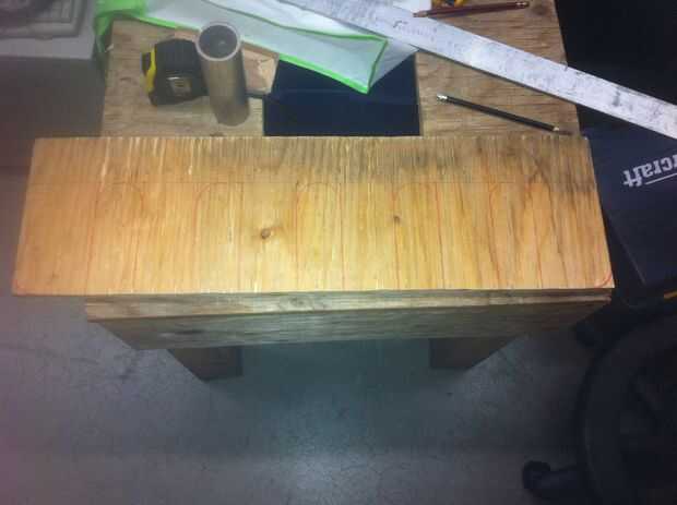 Una vez más, dependerá de su situación exacta, pero necesitaba almacenamiento para cinco ejercicios. Cada taladro necesitada un aproximadamente 2" de la ranura para sostenerlo. También decidí para el interior de las ranuras (y las esquinas de la plataforma como bien - hackspace chic!). Esbozo de las ranuras de cada taladro. En mi caso, dibujé una línea horizontal 2" del borde largo de la madera contrachapada. Luego medí el centro de la línea. Yo sabía que necesitaba cada ranura para ser aproximadamente 2" de ancho, para que mida 1" desde el punto de centro y dibujó las líneas verticales. Se trata de la ranura central. Desde aquí, he añadido otra ranura para 2", 2 1/2" a la izquierda, luego otro. Hice lo mismo a la derecha. Al final, tenía cinco ranuras, todos iguales. La encontré una tubería de 2"(la misma que utiliza para redondear las esquinas). Remonta para la ronda final de las ranuras.