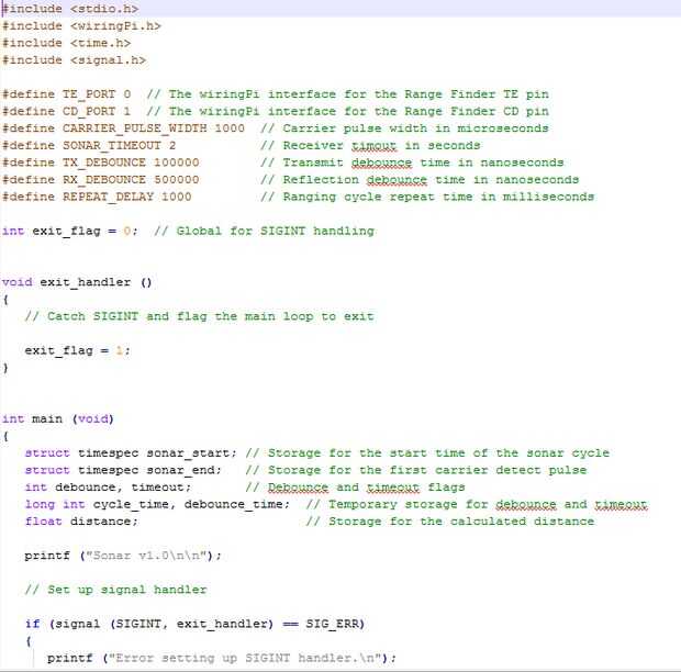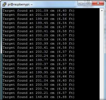 Sonar el programa funciona de forma similar a la utilidad PING IP. Genera un 1ms pulso de ultrasonido de 40KHz y luego espera recibir una reflexión del ultrasonido. Si se encuentra un reflejo objetivo, la distancia se calcula automáticamente y aparece en cm y pies. Metas son "hacer ping" cada segundo hasta que el usuario presiona Ctrl-C.