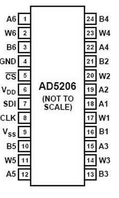 Ahora que tenemos nuestro ecualizador construido, necesitamos una manera de controlar la ganancia de cada banda mediante programación. Una manera fácil de hacerlo es con el potenciómetro digital AD5206. Es esencialmente seis potenciómetros digitales en uno, perfecto para nuestro ecualizador de 6 bandas. Ver este tutorial para obtener más información.