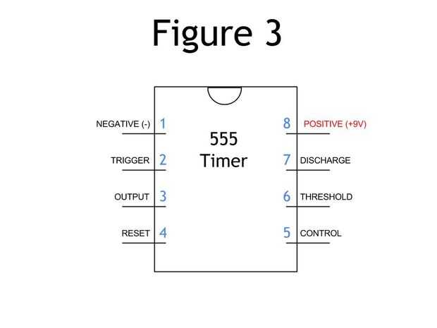 Vea la figura 3: figura 3 muestra los nombres de los pines del Temporizador 555. Qué hace el temporizador 555 es comparar el voltaje en el pin de umbral. Si es menos de 1/3 de la tensión de alimentación (1/3 de 9V es 3V), establece la tensión de salida a + 9V (la tensión de alimentación). Si el pin del umbral es mayor de 2/3 de la tensión de alimentación (2/3 de 9V es 6V), restablece la salida a cero voltios. Así permite echa un vistazo al circuito terminado: figura 4.