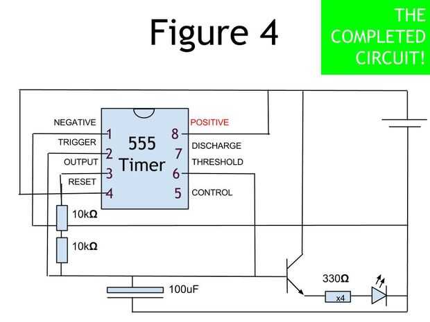 Vea la figura 4: así, en el encendido: el perno del gatillo (pin2) es de cero voltios como el condensador está descargado. Esto fija la tensión de salida a + 9V. El condensador ahora empieza a cargar a través de las 2 resistencias de 10kΩ. Finalmente, como el condensador de carga el voltaje alcanza 2/3 de la tensión de alimentación. En este punto en el proceso, el 'flip-flop' cambia cambios a cero voltios y sucede lo contrario. El condensador ahora las descargas a través de nuestras resistencias hasta que otra vez la tensión llega por debajo de 1/3 de la tensión de alimentación - y 'flip', cambia a + 9V otra vez y las repeticiones de todo el proceso!