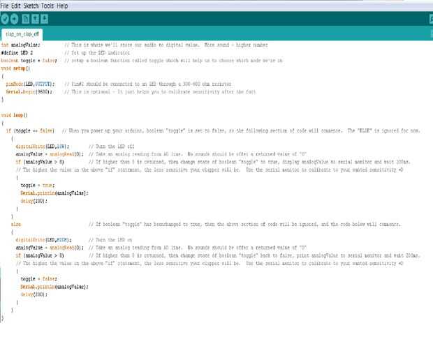 Una cosa que me gustaría destacar es que se puede calibrar la sensibilidad con facilidad! He añadido en una función de impresión de serial que permite ver los valores devueltos cada vez que aplauda. Esto le dará una idea de cómo cambiar la sensibilidad en el código. El los en comparación con los valores más altos, menor será la sensibilidad. Yo uso un compare el valor de "8" en el código. Si haces 15 o superior, la sensibilidad será baja. Si es menor que 8, va a ser extremadamente sensible. Es realmente muy fácil de manipular.
