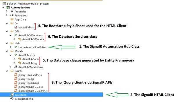 La aplicación Web de ASP.NET SignalR Hub conjuntamente se compone de los siguientes componentes como se indica en el esquema adjunto: