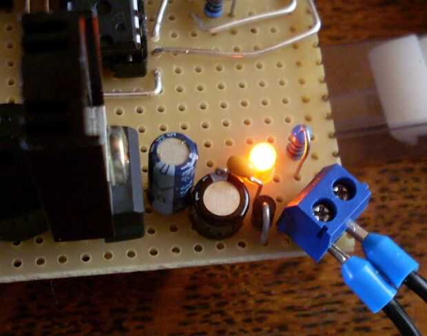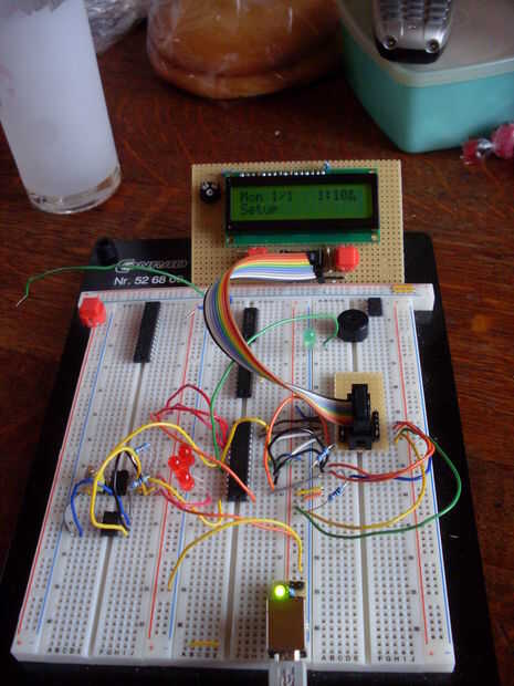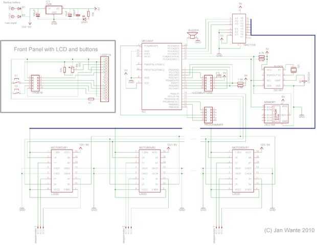 La alimentación debe ser bastante hacia adelante: es una fuente de 5V estándar utilizada en muchos proyectos. Lo único que he añadido son un 'encendido led' y una conexión para una batería de 9V. Los 2 diodos deben impedir que la batería de 9V para 'cargar' cuando el 12V está encendido y viceversa.