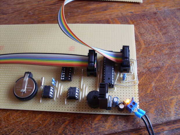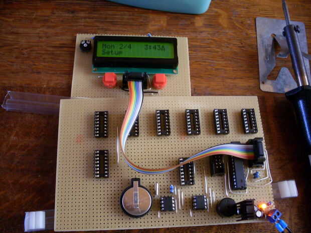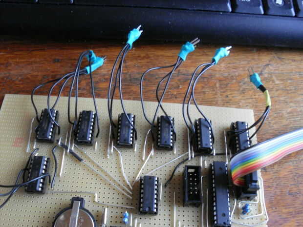 Pc0 es utilizado para el timbre y PC1 a PC3 vaya a la 74HCT238. El 74HCT238 es un convertidor/decodificador de 3 a 8 y decodifica un binario de 3 pines de la entrada a una salida decimal. Lo uso para guardar alfileres en mi microcontrolador. La salida de este IC enciende la tensión lógica de los conductores y establece las patillas enable en 1. Un conductor para cada día de la semana.