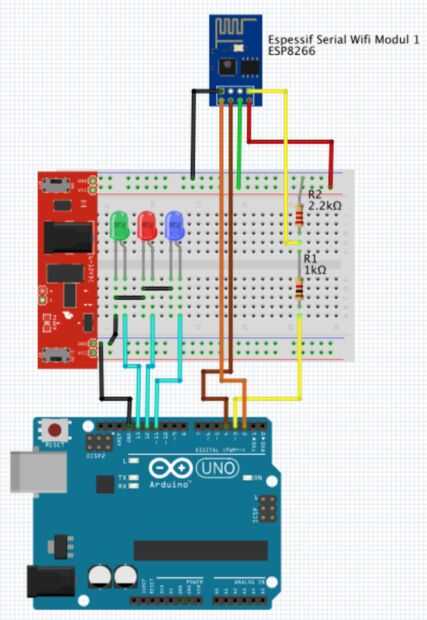 El circuito es muy simple. Las conexiones ESP8266 a Arduino son los mismos que los posts anteriores, añadir 3 LEDs a los GPIOs (esta vez estoy usando un UNO en vez de MEGA, solo para mostrar que todos aprendieron antes también se aplica para ambos dispositivos):