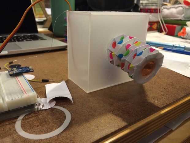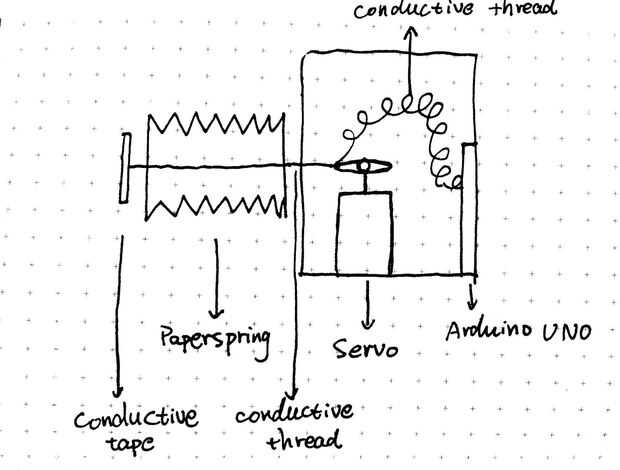 En primer lugar, usted necesita doblar una primavera de papel. Enhebre la aguja con el hilo conductor, penetrar en la primavera de papel en el centro. Fije un lado de la rosca con cinta conductora y la soldadura del otro lado de la momentánea.