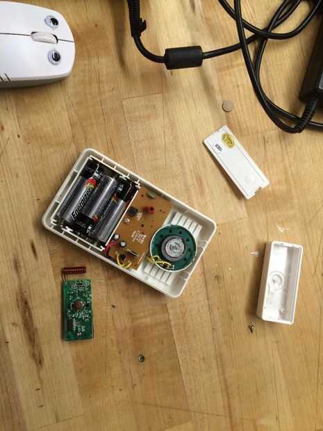 Rasgue abajo el botón de la tonta y averiguar la forma en que se dispara. En mi caso debería haber dos círculos de cobre una vez que están conectados, la campana es accionada. Así que había soldado un cable en cada círculo.