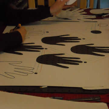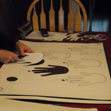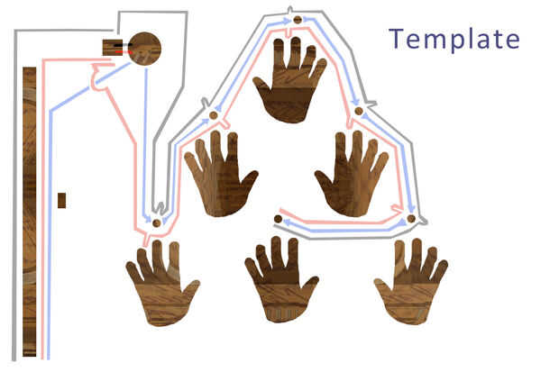 Cuando ya tienes las trayectorias del circuito dibujadas, es tiempo para recortar la plantilla. Usando la navaja Xacto sobre una superficie de corte preparados, corte las seis formas de la mano, la ubicación de Arduino, el capacitor, el interruptor, el Neopixels individual y la franja de Neopixel. Su plantilla está ahora lista para su uso, aunque nosotros volver y agregar más a él más adelante.