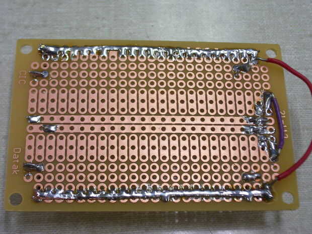 Estos son caminos conductoras que hice con soldadura en una pieza de perfboard que yo entonces soldar todas las conexiones para + 5v y GND.