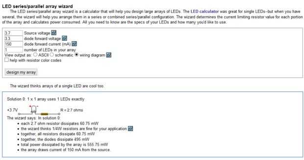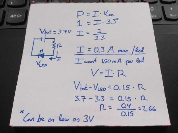Si quería ejecutar los LEDs a plena potencia podría utilizar la segunda fórmula y encontrar el valor de la resistencia, pero en este caso he decidido utilizar la mitad de la energía (0,15 amperios), no sólo porque los LEDs no sea correctamente es, pero también porque quiero que dure más la batería, y 1 vatio de luz es suficiente para mí.