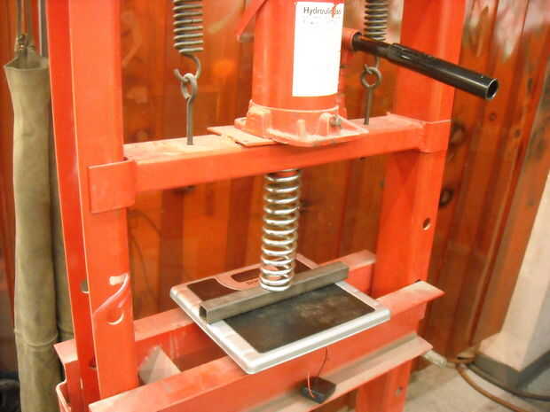 La idea con la tarifa del resorte tiene una cierta cantidad de fuerza para comprimir un resorte una pulgada. Todos hicimos era palillo el resorte en la parte superior la escala y lentamente bombea la manija de la prensa hasta que el resorte comprimido una pulgada. Sería fácil construir una prensa portátil pequeño así como usar un gato de coche pequeño.