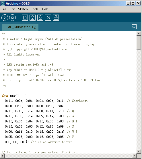 3) traducción y visualización en la LMP. Cada LED está encendido sobre el tiempo que toma para leer el pin analógico, y cada 'frame' (la matriz de 6 x 5) aparece dos veces, para que podamos Mostrar 1.5db pasos. Esto tarda aproximadamente 100mS. El tiempo aquí es crítico - todo más lento, el ojo se empieza a ver parpadeo, demasiado rápidos, los 'patrones' se ven débil y mal formado.
