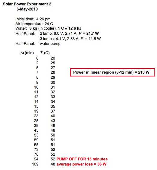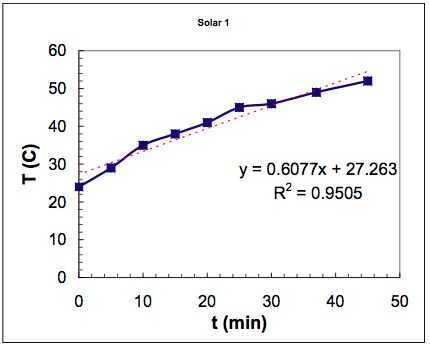 Foto 4 y Foto 5: Resultados de mayo / 6. Segundo día de experimentación. Otra vez usé 3 kg de agua en el refrigerador. Tenga en cuenta que en el minuto 94, apagué la bomba de agua y el agua comenzó a enfriar (a una tasa de pérdida de energía de ~ 56 W). Ver la siguiente foto. Yo estimaba que en la región "más estable" de temperatura aumentar la energía térmica fue de 210 W. Este día el flujo solar era similar, observe que la energía eléctrica para 2 lámparas era casi lo mismo que el día anterior. También observe que la conexión de 3 lámparas en paralelo reduce la potencia eléctrica neta: esto es un factor importante en el diseño de una instalación fotovoltaica completa, usted necesita para optimizar el punto operacional IV! En la parcela, la elevada tasa de aumento de la temperatura en los primeros minutos es probablemente un artefacto de haber utilizado agua fría bastante (BTW: la temperatura del aire era de unos 24 C). En el minuto 94 apagué el agua la bomba y el agua empezaron a enfriar (a una tasa de pérdida de energía de ~ 56 W). Observe como sucedió antes de que la temperatura máxima fue de 52 (c. 126).
