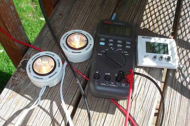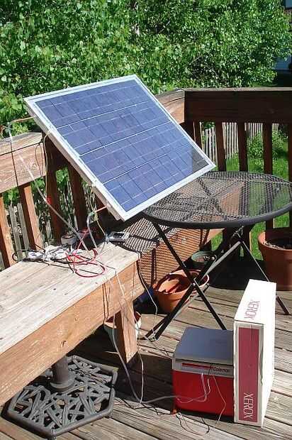 Foto 1: primer día de real prueba (puede / 5). La mitad del panel es encender algunas lámparas de halógeno 12 V. Conectar 1 lámpara este panel medio proporcionaba 9.3 V a 1.47 A (potencia = 14 W), conectándose 2 lámparas la tensión bajó a 7,9 V 2.69 A (potencia = 21 W). Extrapolando al panel de todo esto sería por lo menos 42 W de energía eléctrica (no demasiado mala para hacer este experimento en 16:30, teniendo en cuenta que el máximo teórico para este panel es de 60 W, suponiendo que 1 kW/m ^ 2 de energía solar y 12% de eficiencia de la instalación fotovoltaica). La otra mitad del panel PV alimenta la bomba de agua, que hace el agua circula entre el panel y el refrigerador. Hubo 3 kg de agua en el sistema.