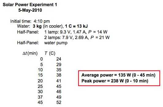 Foto 2 y Foto 3: Resultados de mayo / 5. Dada la capacidad de calor del agua [4,2 kJ /(C kg)], se puede concluir la energía térmica transferida fue cerca de 200 W como máximo (una vez más no está mal teniendo en cuenta que el panel recibió a más de 500 W de luz solar!). Nota que estoy descuidando posibles otras transferencias de calor posible (refrigerador, etc.). Ver el segundo día de experimentos a continuación. El máximo. temperatura alcanzada fue de 52 (c. 126). Muy caliente al tacto.
