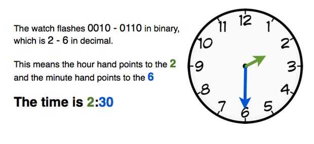 El primer número representa la hora y el segundo representa número hacia el número medio de minutos si se tratara de un reloj analógico. Por ejemplo, si el reloj parpadea 0010-0110, esto corresponde a 2-6, que significa que la hora es 2 y los puntos de aguja de los minutos a los 6. Es 2:30. (Ver la imagen de arriba para una descripción gráfica!) No existe indicación de a.m. o p.m., pero que está claro si es 2:30 de la mañana o no :)