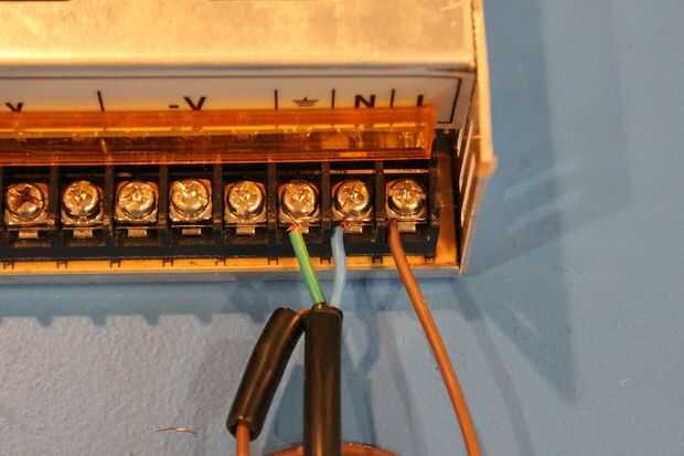 Cortar el extremo no 3 el cable de alimentación y los tres cables dentro de la tira. Hacer algunos googleando para saber que colores de los cables se corresponden con vivo, neutro y de tierra. Para mi cable, vivir es marrón neutro es azul, y la tierra es verde. Conectar neutro y tierra a la fuente de alimentación como se muestra. El hilo debe pasar por el relé así que podemos controlar cuando el amplificador de potencia. Conecte el extremo del cable con el conector normalmente abierto del relé y conectar el pin de carga del relé con el conector directo de la fuente de alimentación. Conecte usando algún alambre de repuesto (utilicé cable de altavoz) + y - de la fuente de alimentación + y - en el amplificador.