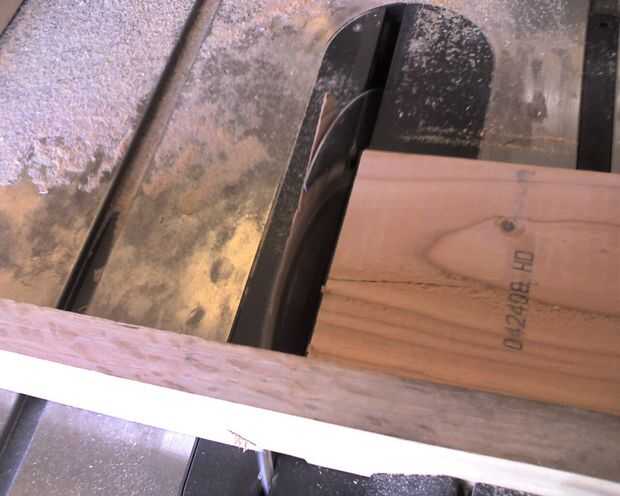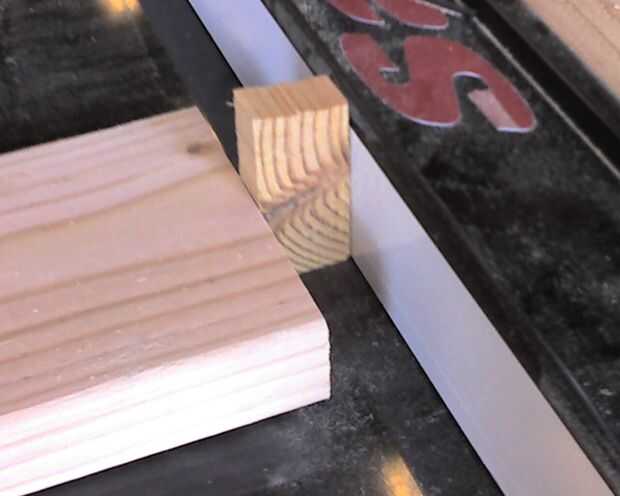 Truco secreto de antirretroceso. Un bloque de espacio es una pieza de madera de desecho utilizado, cuando se utiliza el calibre de ingletes con la valla como una parada. Esto asegura que usted no tiene una parte atrapada entre la lámina y la cerca (tiempo de retroceso!) cuando está tirando de la parte hacia usted o si la parte consejos formas de lado mientras se está cortando. (Generalmente esto sucede justo después de que la pieza es cortada mientras está todavía entre la hoja y la guía.)