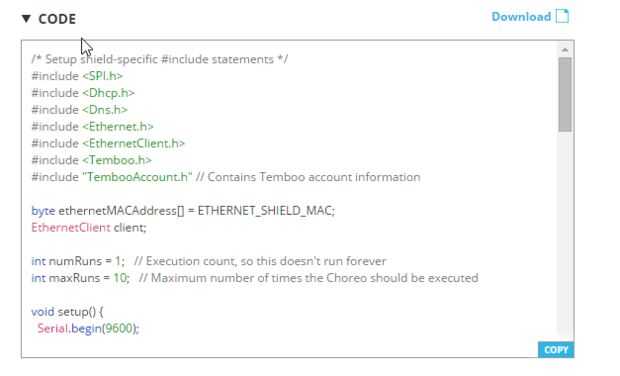 /* Setup shield-specific #include statements */#include #include #include #include #include #include #include "TembooAccount.h" // Contains Temboo account informationbyte ethernetMACAddress[] = ETHERNET_SHIELD_MAC; EthernetClient client;int numRuns = 1; // Execution count, so this doesn't run forever int maxRuns = 10; // Maximum number of times the Choreo should be executedvoid setup() { Serial.begin(9600); // For debugging, wait until the serial console is connected delay(4000); while(!Serial); Serial.print("DHCP:"); if (Ethernet.begin(ethernetMACAddress) == 0) { Serial.println("FAIL"); while(true); } Serial.println("OK"); delay(5000); Serial.println("Setup complete.\n"); }void loop() { if (numRuns <= maxRuns) { Serial.println("Running SendEmail - Run #" + String(numRuns++)); TembooChoreo SendEmailChoreo(client); // Invoke the Temboo client SendEmailChoreo.begin(); // Set Temboo account credentials SendEmailChoreo.setAccountName(TEMBOO_ACCOUNT); SendEmailChoreo.setAppKeyName(TEMBOO_APP_KEY_NAME); SendEmailChoreo.setAppKey(TEMBOO_APP_KEY); // Set Choreo inputs String UsernameValue = "Dominichoogkamer SendEmailChoreo.addInput("Username", UsernameValue); // Identify the Choreo to run SendEmailChoreo.setChoreo("/Library/Google/Gmail/SendEmail"); // Run the Choreo; when results are available, print them to serial SendEmailChoreo.run(); while(SendEmailChoreo.available()) { char c = SendEmailChoreo.read(); Serial.print(c); } SendEmailChoreo.close(); } Serial.println("\nWaiting...\n"); delay(30000); // wait 30 seconds between SendEmail calls }