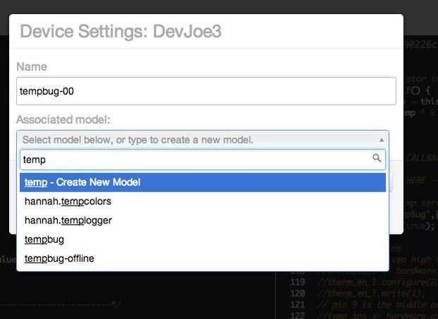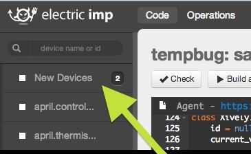 Una buena primera prueba es una prueba de todos los segmentos de para asegurarse de que dispone de conectividad en cada segmento de cada dígito. Abra al electric imp IDE (ide.electricimp.com) y busque su nuevo dispositivo - aparecerán bajo "Nuevos dispositivos" en la columna de navegación izquierda. Haga clic en "Nuevos dispositivos" para ampliar el menú y Mostrar todos los dispositivos (probablemente uno sólo - su nueva Junta Directiva de Emma). Si no ve aquí ningún dispositivo, actualizar su navegador. Una vez que haya encontrado su nuevo dispositivo, haga clic en el ID del dispositivo en la lista de nuevos dispositivos para abrir las opciones del dispositivo; Aquí puede dar su dispositivo un nombre y un conjunto dispositivo modelo. Se establece un modelo de firmware de dispositivo - un firmware del dispositivo, que funciona en el imp localmente y un firmware del agente, que corre en una máquina virtual en el imp eléctrico en la nube. El agente y el dispositivo de comunicación ida y vuelta, y el agente actúa como puerta del dispositivo a internet. Crear un nuevo modelo ahora escribiendo un nuevo nombre de la modelo en el cuadro de nombre de modelo, luego guardar la configuración del dispositivo. El dispositivo aparecerá bajo el nombre del nuevo modelo que has creado, y se abrirá el editor de código.