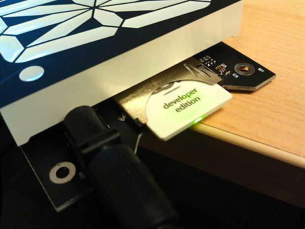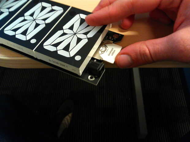 Con los dígitos instalados, puede instalar ahora un imp en la ranura de la imp. Esto es igual de sencillo como instalar una tarjeta SD. Empuje al imp en el zócalo hasta que haga clic.