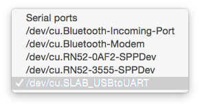 De las distintas formas de enviar mensajes por el puerto USB del ordenador, que vamos a utilizar a Serial Monitor de Arduino IDE para este propósito. Sólo tenemos que elegir la opción adecuada de herramientas → → Serial Port yourserialport (en nuestro caso /dev/cu de . SLAB_USBtoUART) y abriendo la ventana de Monitor serie. Porque no vamos a subir el firmware a la junta con el IDE, no necesitamos preocuparnos por las Junta, por defecto Arduino Uno selección está bien.