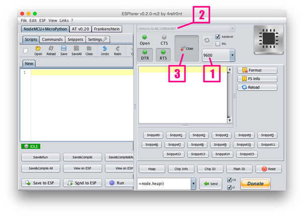 Porque el firmware del NodeMCU es un interprete de Lua estamos necesitas hacer uso de la fantástica herramienta basada en Java escrita por Victor Brutskiy, el ESPlorer. Para una completa introducción guía cubriendo la herramienta ESPlorer, referirse a Rui Santos' documentación.