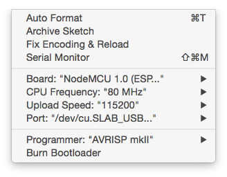 Después de reiniciar el IDE de Arduino ahora podemos seleccionar el tablero estamos utilizando desde la opción de menú herramientas → → del tablero NodeMCU 1.0 (módulo ESP-12E). A continuación, especificamos la correcta Frecuencia de la CPU (herramientas → frecuencia de la CPU: "" → 80 MHz) y Velocidad de carga (herramientas → subir velocidad: "" → 115200). Finalmente, el último paso es seleccionar la opción correcta para el Puerto (herramientas → puerto → /dev/cu. SLAB_USBtoUART).
