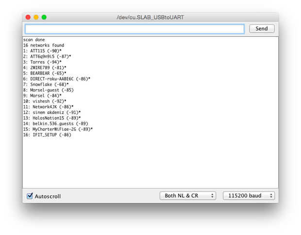 En este punto podemos escribir nuestro propio firmware y cargarlo. Para empezar podemos probar uno de los ejemplos archivo → ejemplos → ESP8266WiFi → WiFiScan. Después de cargarlo, podemos abrir la ventana de Serial Monitor y observar los resultados. Nota que necesitamos para que coincida con la velocidad en baudios, así que compruebe que eso 115200 se selecciona en el menú desplegable