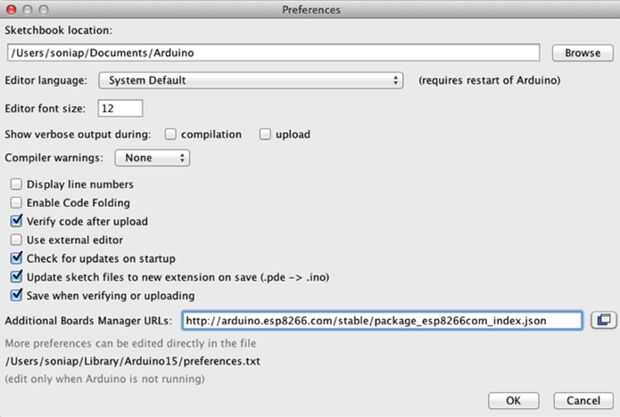En el IDE de Arduino abre la ventana de preferencias e Introduzca la URL a continuación en el campo Adicional tableros Manager URL y seleccione Aceptar.