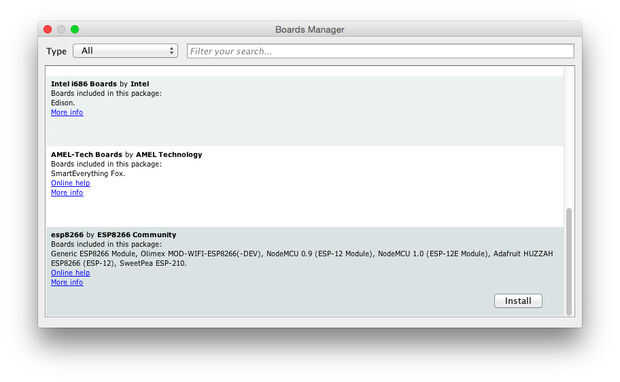 Seleccione la opción de menú herramientas → Consejo → administrador de tablas y desplácese hacia abajo y localice la opción esp8266 comunidad de ESP8266 que debe ser el último artículo en la lista y haga clic en instalar.