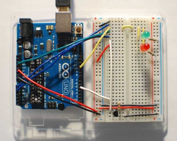 - Salida - se engancha a dos LED, el LED rojo se ilumina cuando el pin está bajo y el verde cuando es alta.