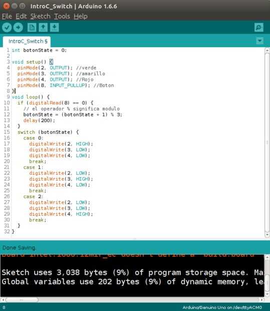 switch (botonState) { case 0: digitalWrite(2, HIGH); digitalWrite(3, LOW); digitalWrite(4, LOW); break; case 1: digitalWrite(2, LOW); digitalWrite(3, HIGH); digitalWrite(4, LOW); break; case 2: digitalWrite(2, LOW); digitalWrite(3, LOW); digitalWrite(4, HIGH); break; } Como ven, si "botonState" es igual a 1, entonces prende el led conectado al pin2, si es igual a 0, y el resto los apaga. Si es igual a 1, etonces prende el led del pin 3 y el resto los apaga, y así sucesivamente. Listo!