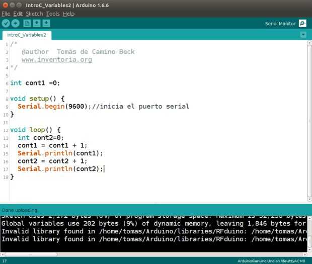 ¿Diferencia hay entre cont1 y cont2? Carguen en el Arduino y abran el puerto serie. Verán el resultado de la foto. Es decir cont2 siempre será 1, mientras cont1, lazo de la vuelta "cada por se va incrementando en 1". Esto es por la razón explicada antes, ya cont2, "muere" al final del bucle, y es creada nuevamente al iniciar otro lazo, y por lo mismo no recuerda nada del bucle anterior. La variable cont1 en cambio, sigue recordando lo tenía el bucle anterior y por eso va incrementando.