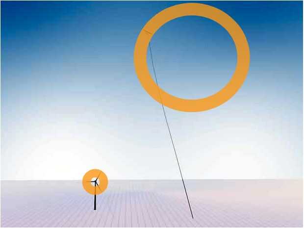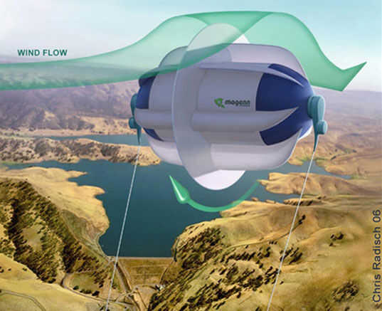 Hasta ahora, turbinas de viento de aire han sido inmóviles, sólo a la cara el viento, como el sistema de Magenn Air Rotor aparece a la derecha. Un sistema como este no sólo es poco imaginativo, pero carece del tamaño y área de un terreno basado en la turbina de viento. La única ventaja que ofrece Magenn es que funciona en altitudes más altas, pronto. Un sistema de la cometa, como se propone en este proyecto no sólo enfrentaría el viento como el sistema de Magenn air rotor, pero tal cometa volaría en un camino predeterminado de viento desde el punto de anclaje y el movimiento de la cometa le b e redirigido a transversal al viento. La cometa volaría en un eje orbital, es el mismo sentido que la hoja de una turbina de viento vuela transversal al viento. El viento no sólo apoyar la cometa en este sistema, pero también sería estar generando electricidad utilizable. La cometa en este caso, sería imitar el movimiento de rotación de la punta de la turbina de viento. La punta de la turbina de viento es una de las partes más eficientes del molino que constituye el 25% de la hoja. En algunos casos, la punta de la turbina eólica produce 75% de la potencia generada. La punta está rotando a la velocidad más alta debido a que está arrasando la mayor parte de la hoja.
