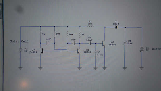 La señal es sacada del colector de Q1 y junto con el condensador de 15nF a la base del transistor Q3 que se configura como un interruptor. Resistencia R5 se utiliza para proporcionar una carga de la señal y da un fósforo de la impedancia adecuada a la etapa anterior. Transistor Q3 está en o apagado y cuando, pasa corriente por el inductor de 1mH L1 a tierra. (Tenga en cuenta que cuando el transistor está en y aparece una señal en el colector, el diodo tiene una acción de bloqueo a la señal, manteniendo desde que sale al condensador C4) Durante el período cuando la corriente no fluye por el transistor, el campo magnético que había sido establecido por la corriente que fluye por el inductor colapsa, induciendo una fuerza contraelectromotriz que atraviesa el diodo para cargar el condensador. El condensador almacena la carga y durante cada descarga posterior de L1, se añade más tensión que se acumula la carga a un valor que puede ser muchas veces el voltaje de entrada. En este circuito, se acumula la tensión de un volt a un no valor de 4,76 voltios de carga. Este circuito sólo es capaz de lenta carga dos baterías de AA como la corriente de salida se limita a un par de miliamperios.