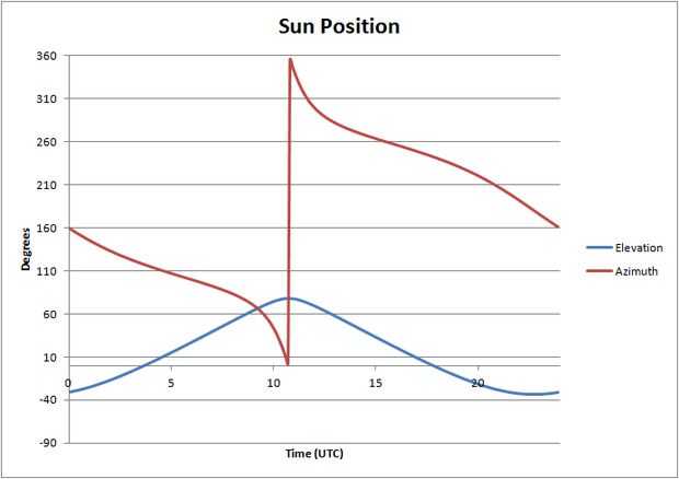 Si coges un vistazo a la parcela anterior, verá que la elevación se extiende de 0° a aproximadamente 78° y luego a 0°. Este ángulo representa la "altura" del sol sobre el horizonte.