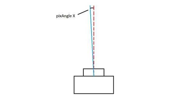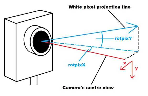 Así que ahora estamos trabajando con un único píxel blanco que se convertirá en un solo punto de datos. En este bucle primero tenemos que convertir las coordenadas XY de píxeles blancos en ángulos que actúan como el XY los ángulos de la línea de proyección imaginaria desde el centro de la visión... cheque las imágenes para ver lo que estoy hablando.