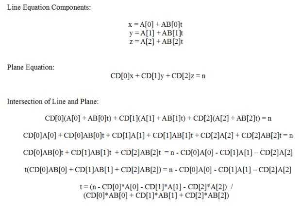 Ahora utilizamos una versión cambiada de la ecuación del plano con la ecuación de la línea insertada en él y resolver para ' t '. Ver la ecuación reorganizada en las imágenes. Entonces el resultado de la materia para ' t ' en las ecuaciones de la línea XY y Z. Así que ahora tenemos nuestras coordenadas XYZ para un solo punto de datos. Empujar en los vectores 'drawpoint' que llevan a cabo cada punto.
